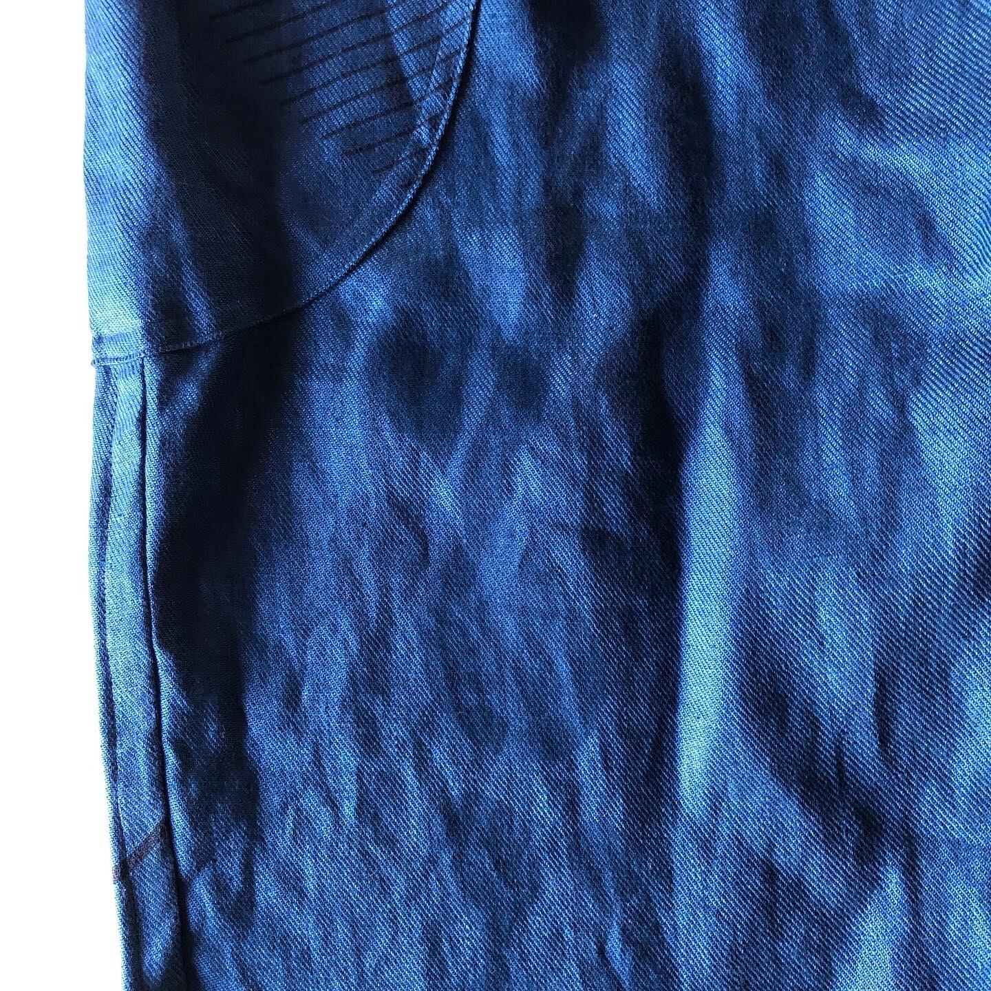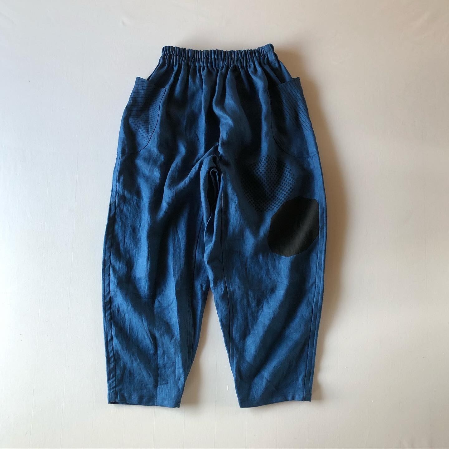 リネン100%ブルーにシルクプリント もんぺパンツ 丈95cm